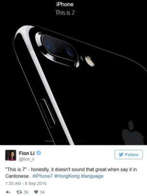 Apple, sin embargo, pareció tenerlo en cuenta y utilizó una traducción ligeramente diferente en su eslogan en China ("7, está aquí"), Taiwán ("Exactamente es 7") y Hong Kong ("Esto, es exactamente iPhone 7").