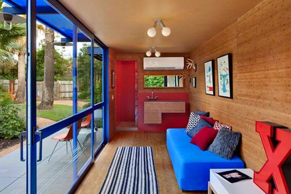 Uno de los contenedores esta pintado de azul, el otro, se seccionó en dos partes y se solapo al contenedor azul para añadir espacio habitable. Después de haber ensamblado todas las piezas añadieron las ventanas y las puertas correderas.