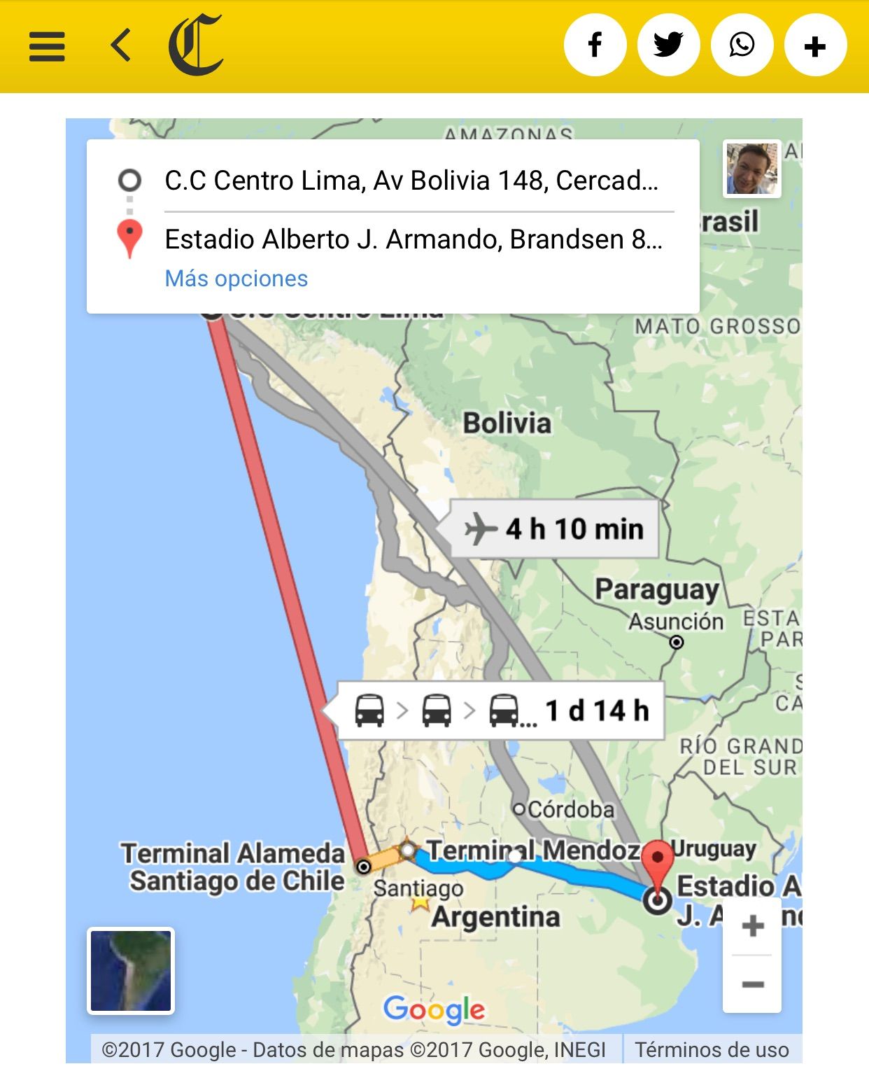 Utilizando la aplicación móvil, Google Maps es posible conocer la distancia que existe entre Lima y Buenos Aires. También saber cuánto demorará un hincha en llegar a Argentina, sea en avión, en autobús o en un vehículo particular.