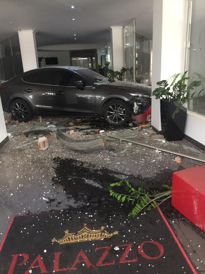 Agobiada por los celos, una mujer estrelló su lujoso auto contra el lobby del motel Palazzo, en la ciudad colombiana de Cali, donde al parecer se encontraba su marido con otra persona.