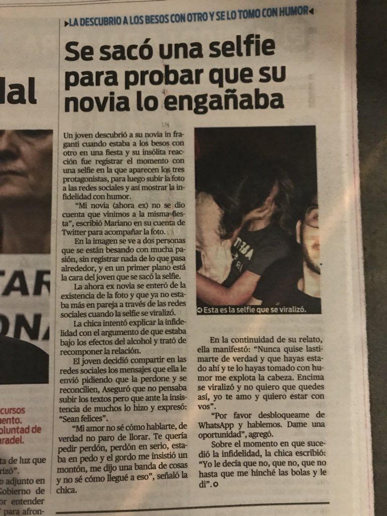 Mariano, un joven argentino, se convirtió en protagonista de una noticia que se hizo viral a nivel internacional al hacer pública su reacción ante la infidelidad de su novia. Al descubrir a su pareja besándose con otro en una fiesta -a la que ambos concurrieron sin saberlo de antemano-, el hombre se tomó la situación con humor sacándose una selfi con ellos y publicándola en su cuenta de Twitter.