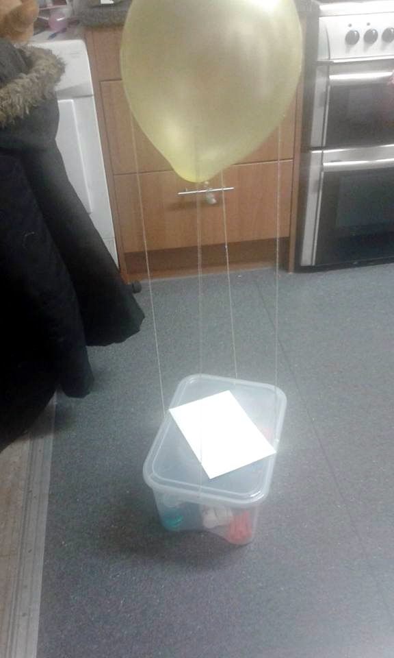 Y entonces Kim se dio cuenta de que el mejor regalo de cumpleaños para su novio sería precisamente eso: un contenedor parecido a una caja de suministro lleno de bebidas alcohólicas reales. Junto con las bebidas, Kim puso en el contenedor armas y medicamentos artificiales y ató la caja a un globo.