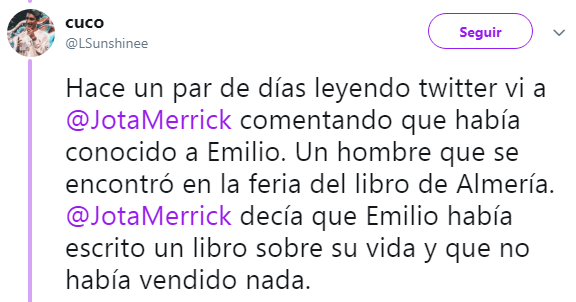 Fue un tal Cuco (@LSunshinee) quien contó que leyendo a otro tuitero se enteró de que había conocido al longevo escritor en la Feria del libro de Almería, donde éste le confesó que no había vendido ningún libro.