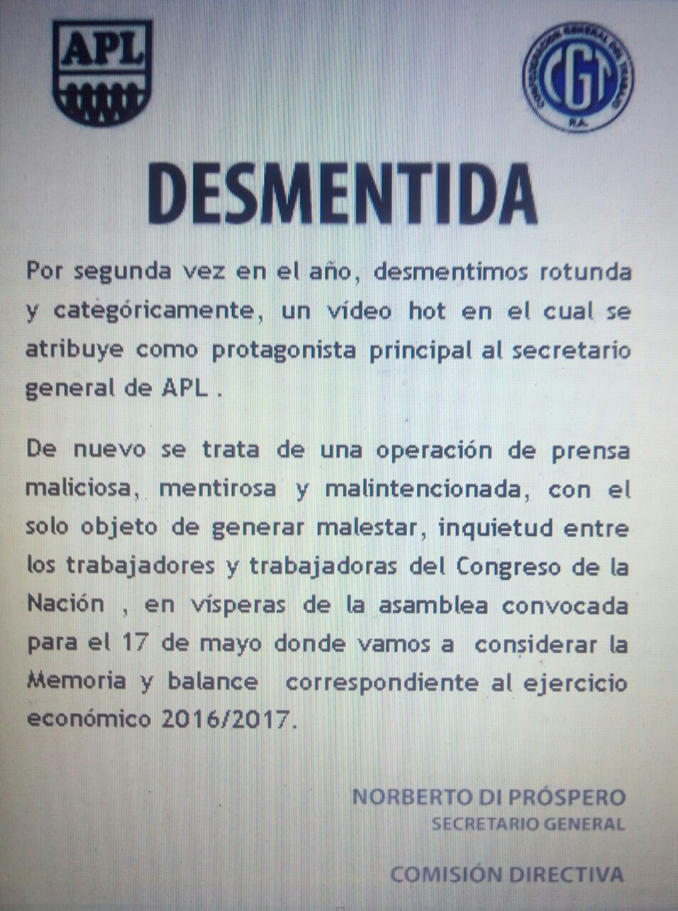 " Por segunda vez en el año, desmentimos rotunda y categoricamente un video hot en el cual se atribuye como protagonista al secretario General de APL", dice el escrito gremial.