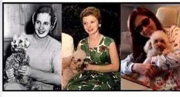 Lo tuiteó alguien que adoptó el nombre de @frankie69AC, lo cual no dice mucho. mejor: prácticamente nada. Pero difundió la foto de tres mujeres peronistas con sus perros en la historia argentina y concluyó -en forma imposible- de que podría tratarse del mismo animal a lo largo de 70 años. Claro, lo hizo en forma cínica, si se quiere. Mirá: