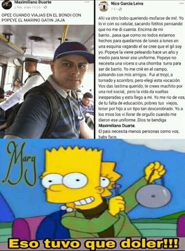 "Opee, cuando viajas en el bondi con Popeye el Marino". Con esa la leyenda acompañó un joven, identificado como Maximiliano Duarte, una fotografía que publicó en su perfil de Facebook, en la que detrás de él aparece un integrante de la Armada de Argentina con su habitual uniforme.