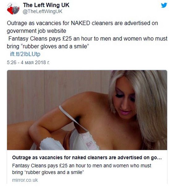 Los usuarios del portal británico de búsqueda de empleo Universal JobMatch se quedaron estupefactos al encontrar una oferta de la compañía Fantasy Cleans que buscaba hombres y mujeres dispuestos a limpiar casas desnudos, informa el diario The Mirror.