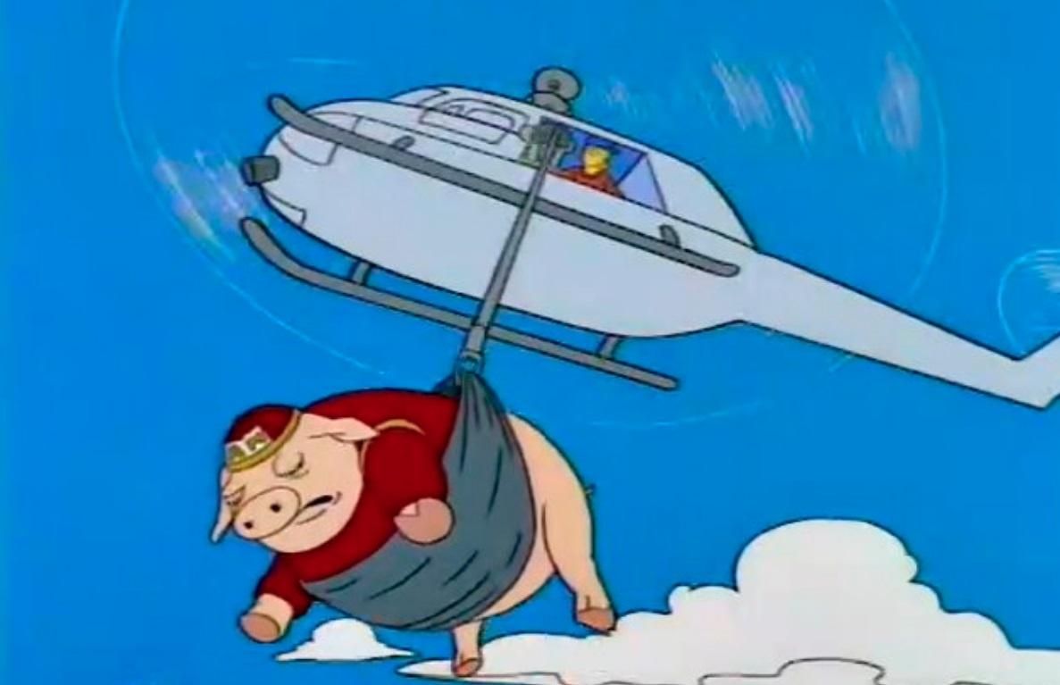 Una de las principales comparaciones que se realizó, fue con el cerdo que apareció en la serie animada, Los Simpson, donde justamente se lo ve bajando de un helicóptero colgado de una cuerda.