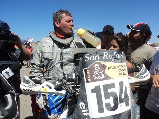La preparación física. “Cuento con un personal trainer con quien me entreno diariamente. Estuve en el Six Day buscando ritmo pero por lo general salgo en la moto. Es fundamental estar bien, sobre todo por la manera en la que voy a encarar. Se descansa poco, si rompes casi no dormís, entonces hay que llegar lo mejor posible”. El Kato se hidrata luego de culminar una especial del Dakar 2012.
