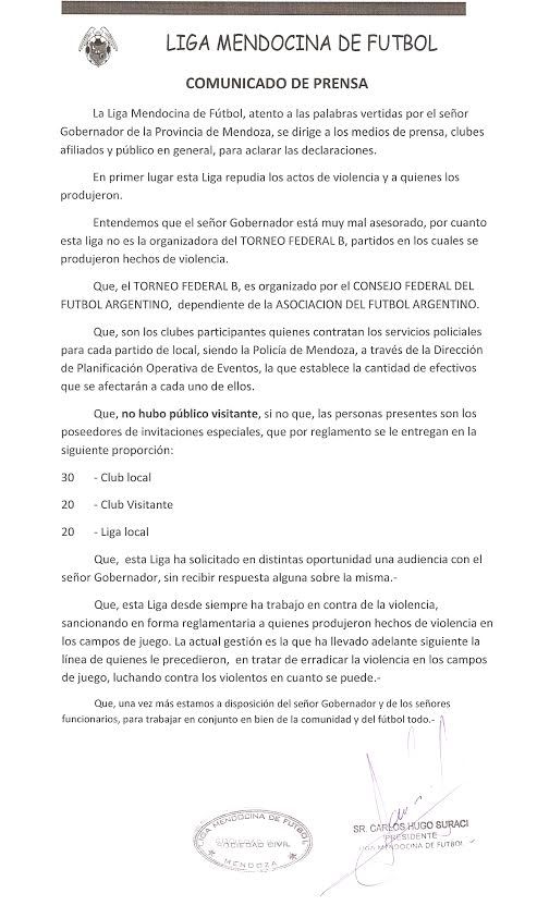La Liga Mendocina de Fútbol emitió un comunicado luego de las declaraciones del Gobernador Francisco Pérez en relación a los incidentes del pasado domingo.