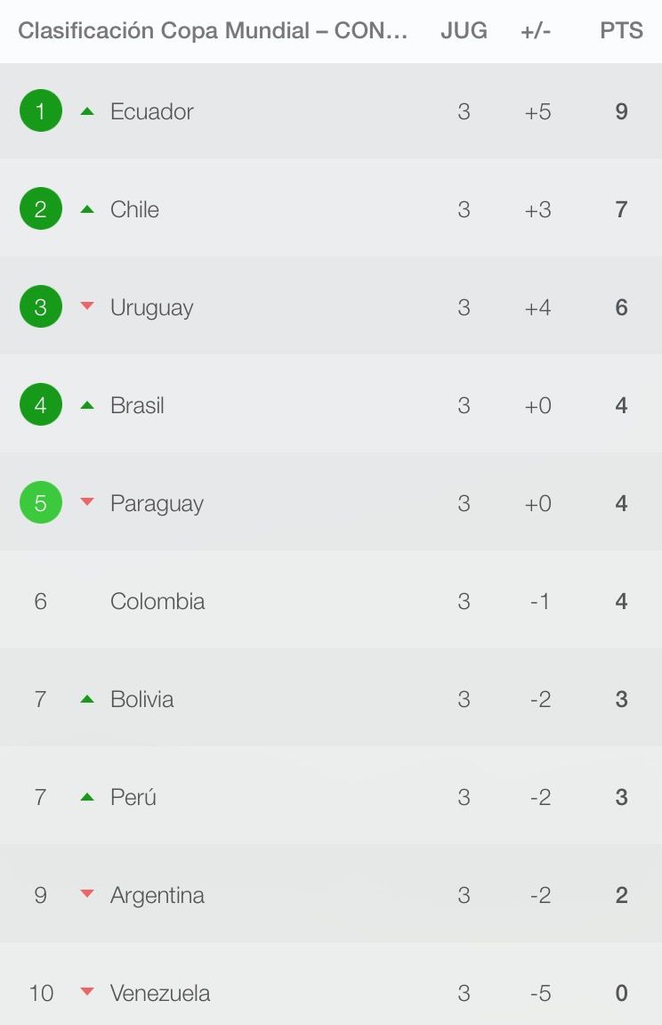 Argentina acumula solo dos puntos de nueve posibles y se ubica en el penúltimo puesto de las Eliminatorias. De esta tabla de 10 equipos clasificarán 4 de forma directa a Rusia 2018 y el quinto clasificado buscará un lugar en la repesca.