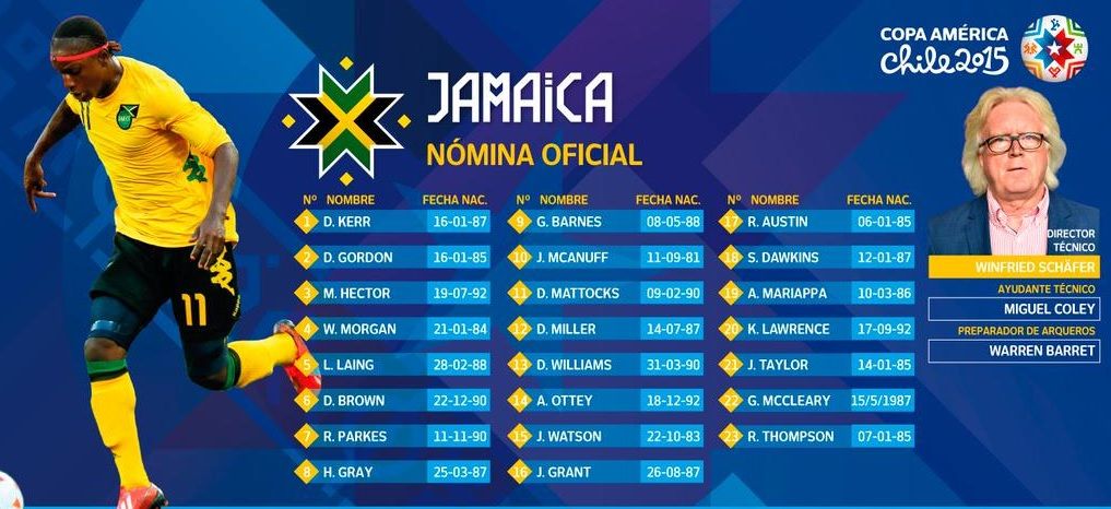 Jamaica, el otro invitado, tal vez llegue como el rival más débil de la competencia, aunque con un entrenador estudioso, el alemán Winfried Schäfer de 64 años, ganador de la Copa Africana de Naciones en 2002. También estuvo al frente de las Selecciónes de Camerún y Tailandia.