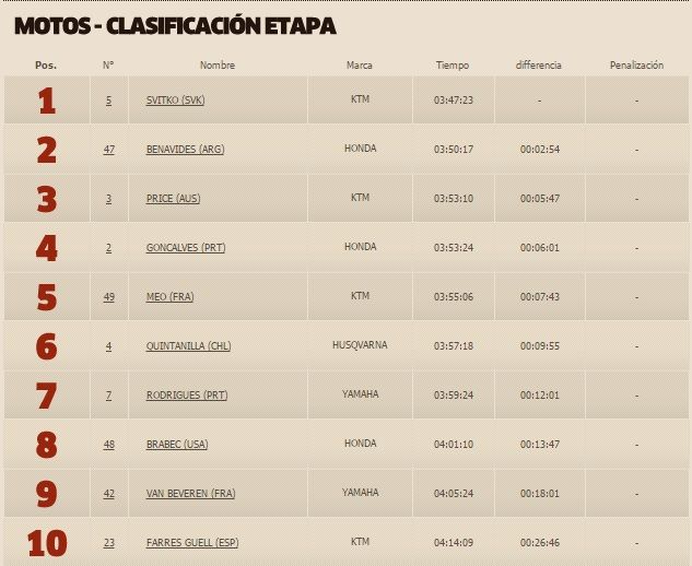 El eslovaco Stefan Svitko (KTM) recortó este miércoles en 5:47 minutos la desventaja con respecto al líder, Toby Price (KTM), al imponerse en la etapa maratón del Dakar, aunque el australiano, que acabó tercero, se mantiene como líder cómodo en la clasificación general de motos.