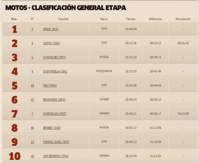 Tras esta jornada, y con tres etapas por delante para acabar la carrera, Price mantiene una diferencia de 23:12 minutos sobre Svitko.