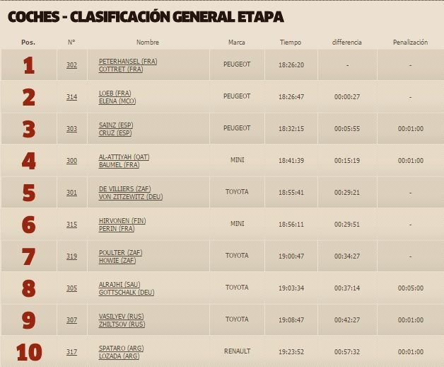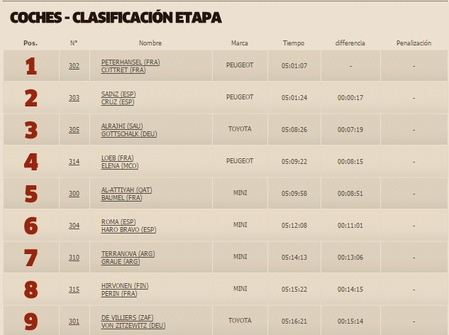 Hoy le tocó a Stephane Peterhansel quien aprovechó toda su experiencia para la navegación y desbancó a Sebastien Loeb de la clasificación general ya que le sacó más de ocho minutos. Carlos Sainz terminó finalmente segundo, a 17s, y es tercero en el total de tiempos. El saudi Alrajhi (Toyota) culminó tercero, enviando a Loeb al cuarto lugar.