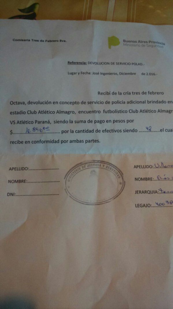 En el comunicado, la Policía Federal informó que devolvió los $16.896pesos que el club Almagro había pagado por 48 efectivos. Sin embargo, hay diversas versiones encontradas ya que desde el Club habían asegurado que habían pedido que participen, al menos 100 efectivos.