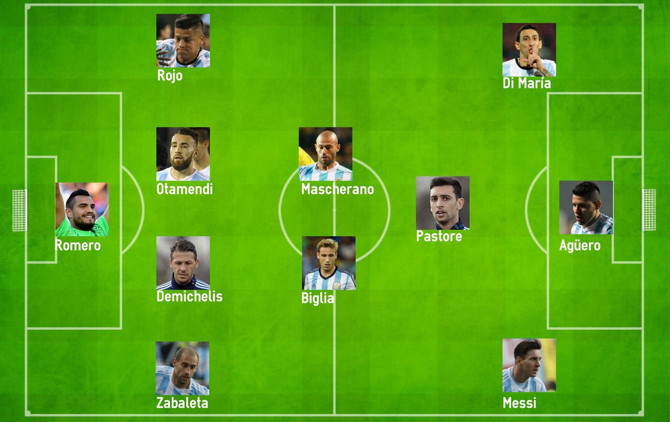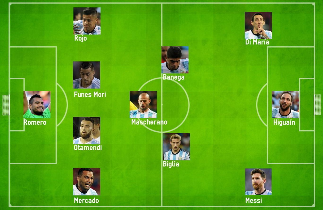 En el arco no cambia nada, siempre Sergio Romero. En la última línea dos modificaciones, el ingreso de Gabriel Mercado por Pablo Zabaleta (lesionado, no integró la lista de 23) y del mendocino Ramiro Funes Mori por Martín Demichelis (se retiró de la Selección argentina). En la mitad del campo ya no estará Javier Pastore (será parte del banco de los suplentes) y si lo hará Ever Banega. Finalmente, entre los tres de punta, el cambio tiene que ver con la inclusión de Gonzalo Higuaín por Sergio Agüero (el Pipita se ganó el lugar tras la gran temporada en Italia).