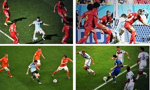 La Pulga maniobrando solo entre miles de piernas de los rivales, que intentan detenerlo como sea.