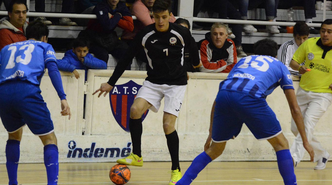 Mauricio Politino pisa el balón. Facundo Miranda (15) y Diego Koltes (13) lo marcan.