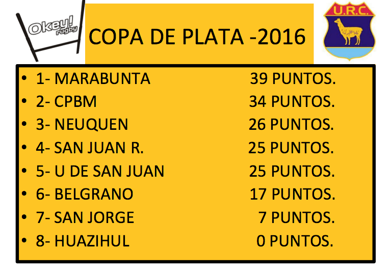 En la Copa de Plata Marabunta de Río Negro le ganó a Belgrano por 23 a 19 (4-1) que luego de ir perdiendo 19 a 3 se quedó con la punta del Torneo. Por otra parte, San Juan Rugby se metió en la pelea por la clasificación luego de ganarle a CPBM por 28 a 23 (5-1).
