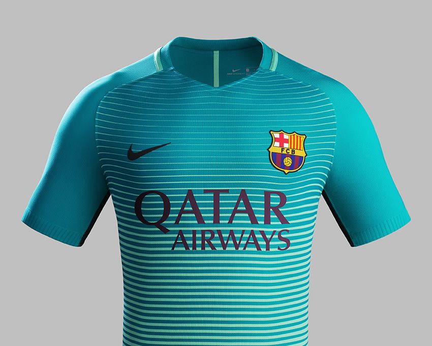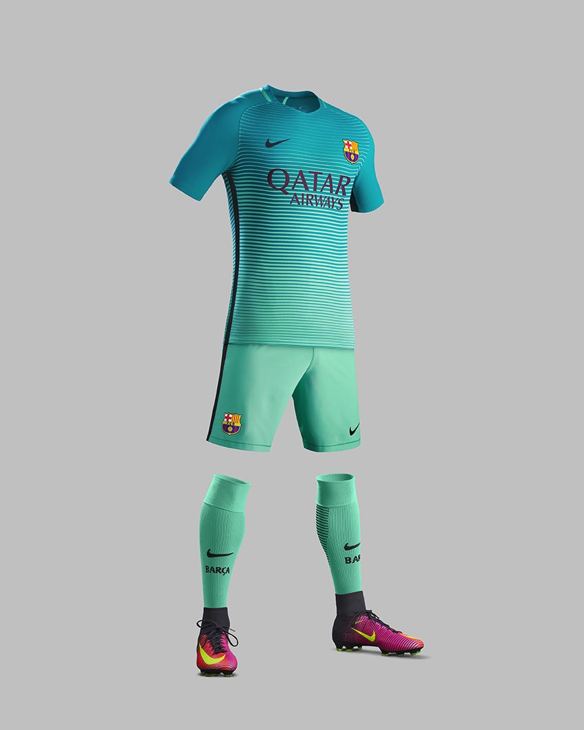 Esta nueva equipación incluye dos nuevos tonos de verde, que son una versión moderna de un distinguido color que el FC Barcelona ya había utilizado anteriormente. La nueva camiseta presenta un dinámico estampado de líneas horizontales de color verde oscuro sobre un fondo de color verde claro brillante, que se van desvaneciendo a medida que alcanzan el dobladillo, creando una sensación de velocidad y movimiento.