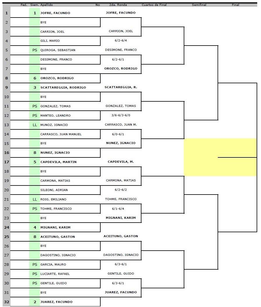 En la parte baja del cuadro, Matías Carmona le ganó a Adrián Sileoni por un doble 6/2, Francisco Tohme(PS) superó a Emiliano Roig (LL) por 6/1 y 6/4; Ignacio Dagostino a Mauro García (PS) por 6/3 y 6/1 y Guido Gentile (PS) a Rafael Luciarte (PS) por 6/3 y 6/1.