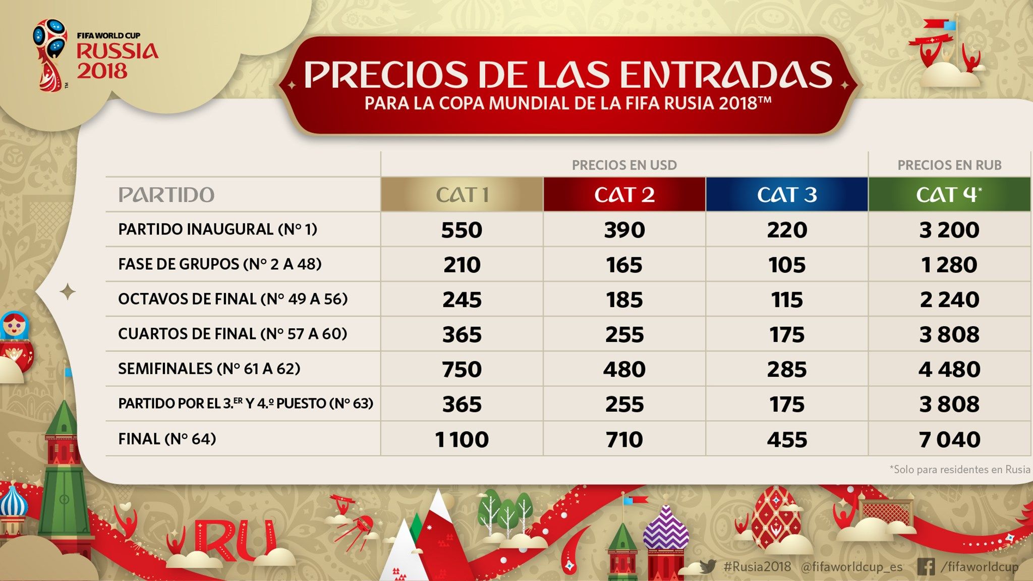 Aunque aún no está confirmada la fecha en la que comenzarán a venderse los tickets, la FIFA informó antes de la Copa Confederaciones los valores de las entradas para el Mundial.