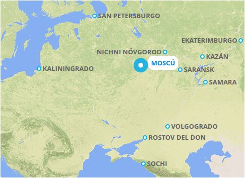Los estadios de la Copa del Mundo serán 12: Ekaterimburgo Arena, Kaliningrado, Kazán Arena, Luzhnikí (Moscú), Otkrytie Arena (Moscú), Nizhni Nóvgorod, Rostov Arena, San Petersburgo, Samara Arena, Mordovia Arena (Saransk), Fisht (Sochi) y Volgogrado Arena.