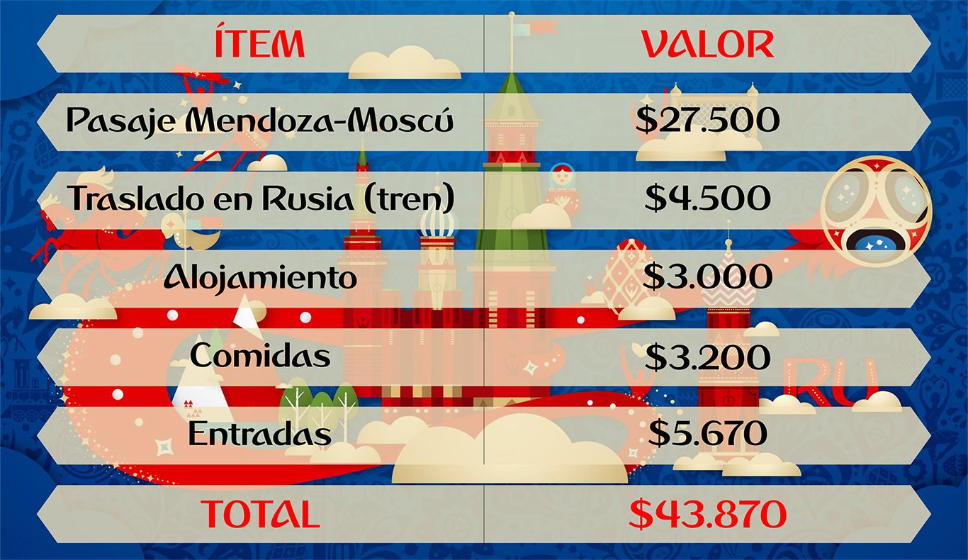 Lo primero que hay que tener en cuenta es el viaje hasta Rusia. Desde Mendoza, hoy, se pueden conseguir pasajes por unos $27.500, saliendo el 13 de junio del año próximo y regresando el 29 de junio.