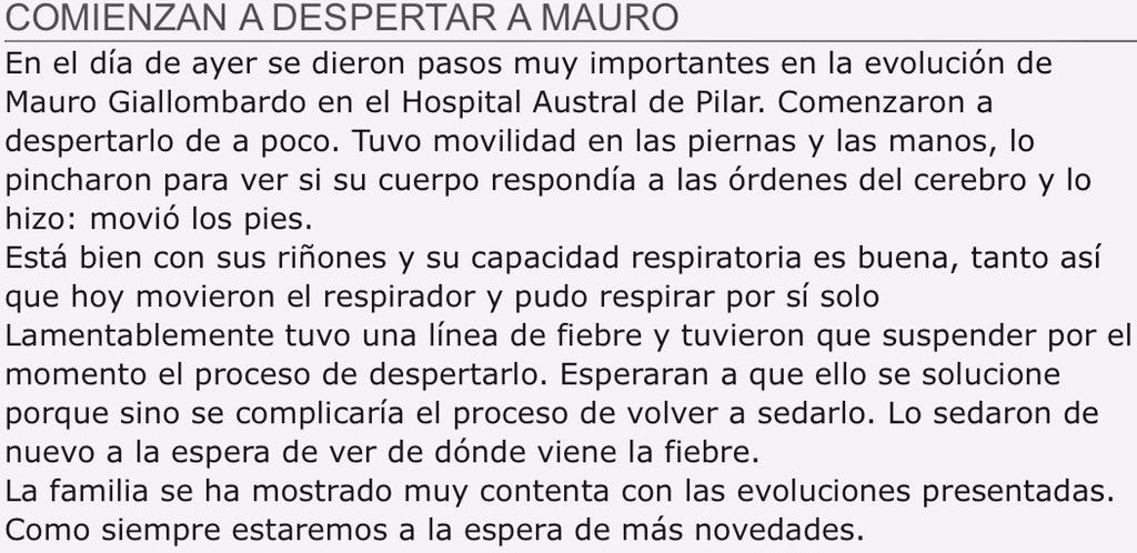 El proceso de estimulación tuvo que ser interrumpido porque el quilmeño de 27 años levantó unas líneas de fiebre y tuvo que ser sedado nuevamente. Según la información que detalló TC La Revista, sus riñones y capacidad pulmonar es buena y hasta logró respirar por sí mismo, sin la ayuda de aparatos.