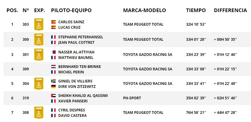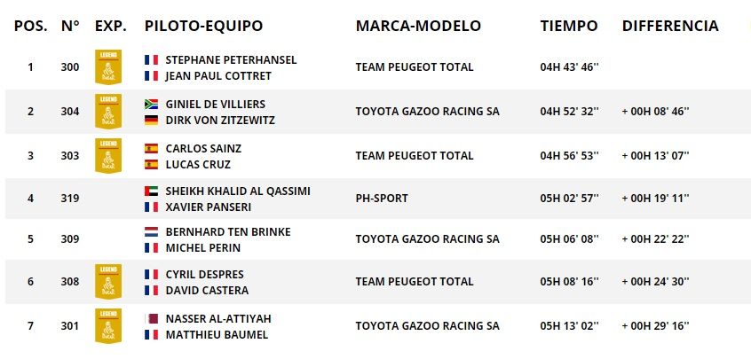 El francés necesitó 4:43:46 para llevarse el triunfo en Belén y aventajó en ocho minutos al sudafricano Giniel de Villiers (Toyota) y en 13.07 a Carlos Sainz, quien se repuso a la perfección de la sanción recibida este lunes por la organización. El madrileño ha perdido algo de tiempo, pero sigue gozando de una buena renta al frente de la tabla.