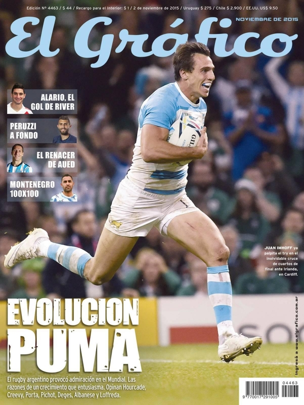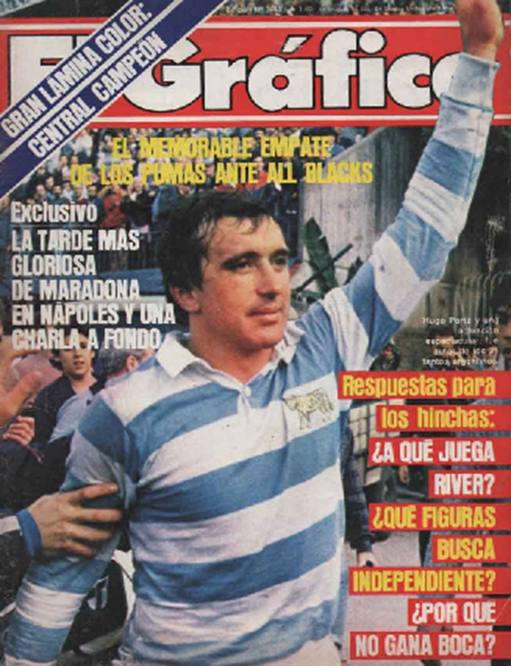 Cuando Los Pumas obtenían algún triunfo glorioso la tapa era de los protagonistas del rugby. Por ejemplo, Hugo Porta fue partícipe de varias. La que tengo más presente es la del triunfo de Sudamérica XV ante Sudáfrica en tierras africanas por 21 a 12 con todos los puntos sumados por el pie del gran apertura. Hugo Porta en la edición 3.448, del 5 de noviembre de 1985, tras el empate ante Nueva Zelanda.
