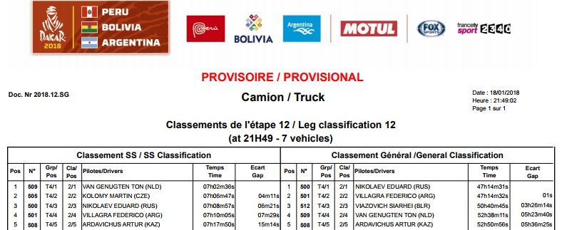 De las doce etapas sólo una fue cancelada (9na) y por esa razón causa sorpresa ver que tras hacer meta en San Juan la diferencia entre Eduard Nikolaev y Federico Villagra sea de tan sólo un segundo en la general de los camiones.