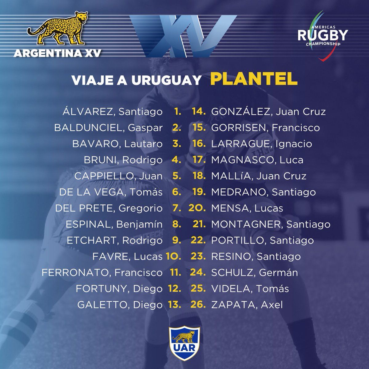 Apostando nuevamente a la rotación de jugadores entre partidos, el staff de Argentina XV designó a los 26 nombres que el jueves estarán viajando a Punta del Este, para jugar ante Uruguay por la tercera fecha del Americas Rugby Championship.