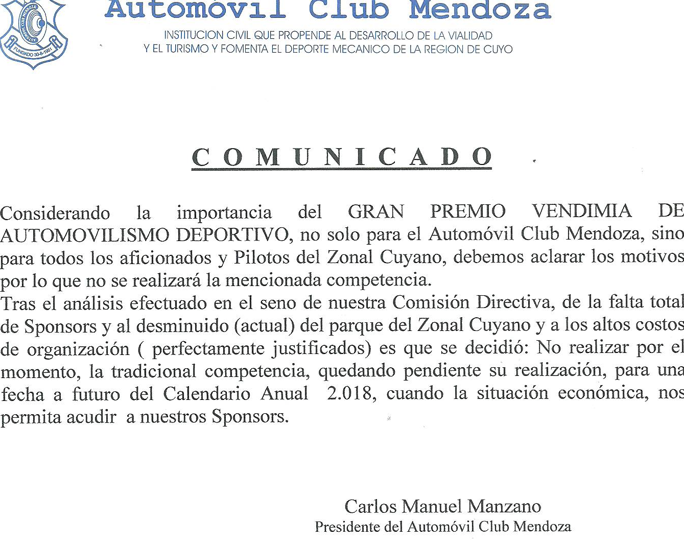 El 10 de junio era la fecha asignada para que el ACM realizara su tradicional "Gran Premio Vendimia" pero por "falta total de sponsors, el disminuido parque y los altos costos de organización", decidieron dar un paso al costado dejando la prueba acéfala y un escenario confuso.