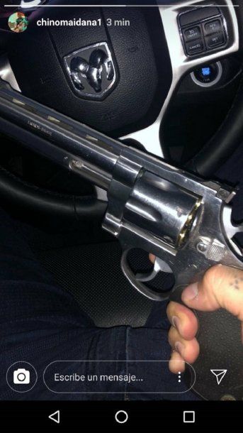 Este viernes se mostró en su vehículo, una Dodge Ram, con un revolver tomado por su mano derecha en la que exhibió el clásico tatuaje tumbero de los cinco puntos que significa que se ha pasado por la cárcel.