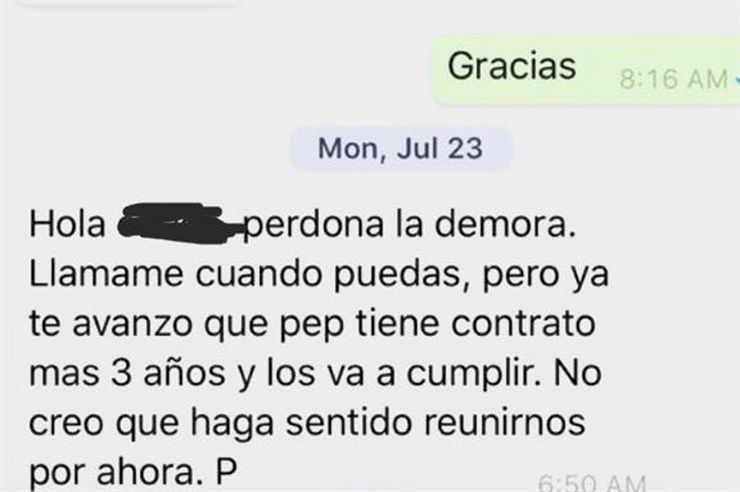 "Llámame cuando puedas, pero ya te avanzo que Pep tiene contrato (por) más (de) tres años y los va a cumplir. No creo que haga sentido reunirnos por ahora", dice el mensaje de Whatsapp que Pere le envió el lunes 23 de julio al hombre que lo contactó por pedido de la AFA".