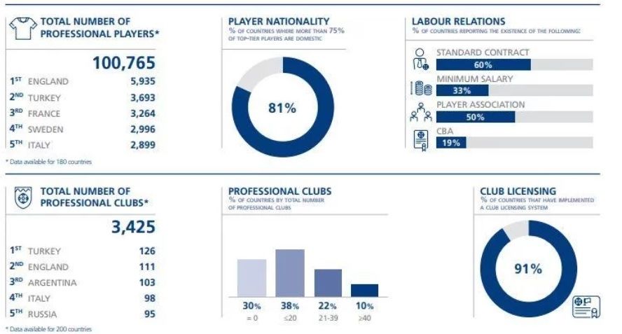 La entidad con sede en Zúrich, Suiza, realizó un informe sobre el fútbol profesional y Argentina aparece como el tercer país con más clubes profesionales registrados con los mencionados 103.