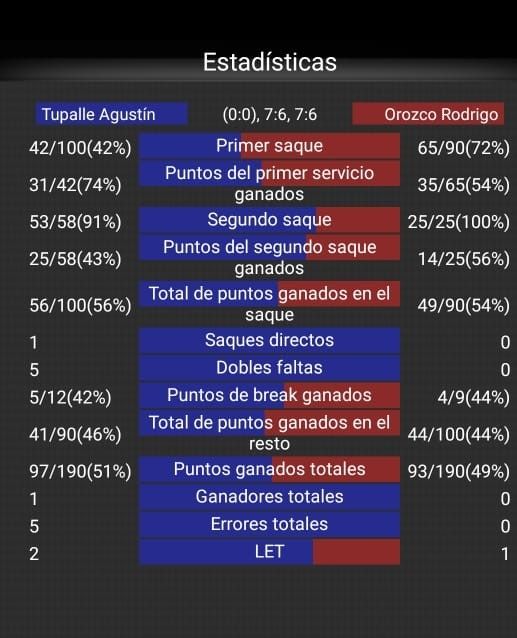 El partido arrancó con un Orozco muy metido en el partido, que logró una rápida ventaja de 4 a 1 ante un tibio Tupalle. Pero algunos piques malos, una seguidilla de errores no forzados de Rodrigo y una oportuna reacción de este último hicieron que Agustín igualara el marcador en 4 games por lado y luego, con su servicio, pasara al frente.