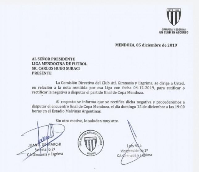 Gimnasia aceptó jugar y habrá final de la Copa Mendoza