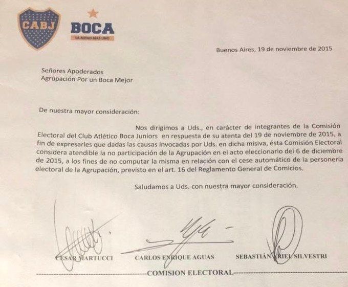 Según informa TyC Sports, desde Identidad Xeneize aseguran que se encuentran en condiciones de presentarse normalmente al acto del domingo y presentaron una misiva que la Comisión Electoral le envió a la agrupación que se encuentra en el foco de la cuestión reconociendo que su ausencia en las elecciones del año 2015. Dicha carta lleva incluso la firma de Aguas, junto con las de César Martucci y Sebastián Silvestri.