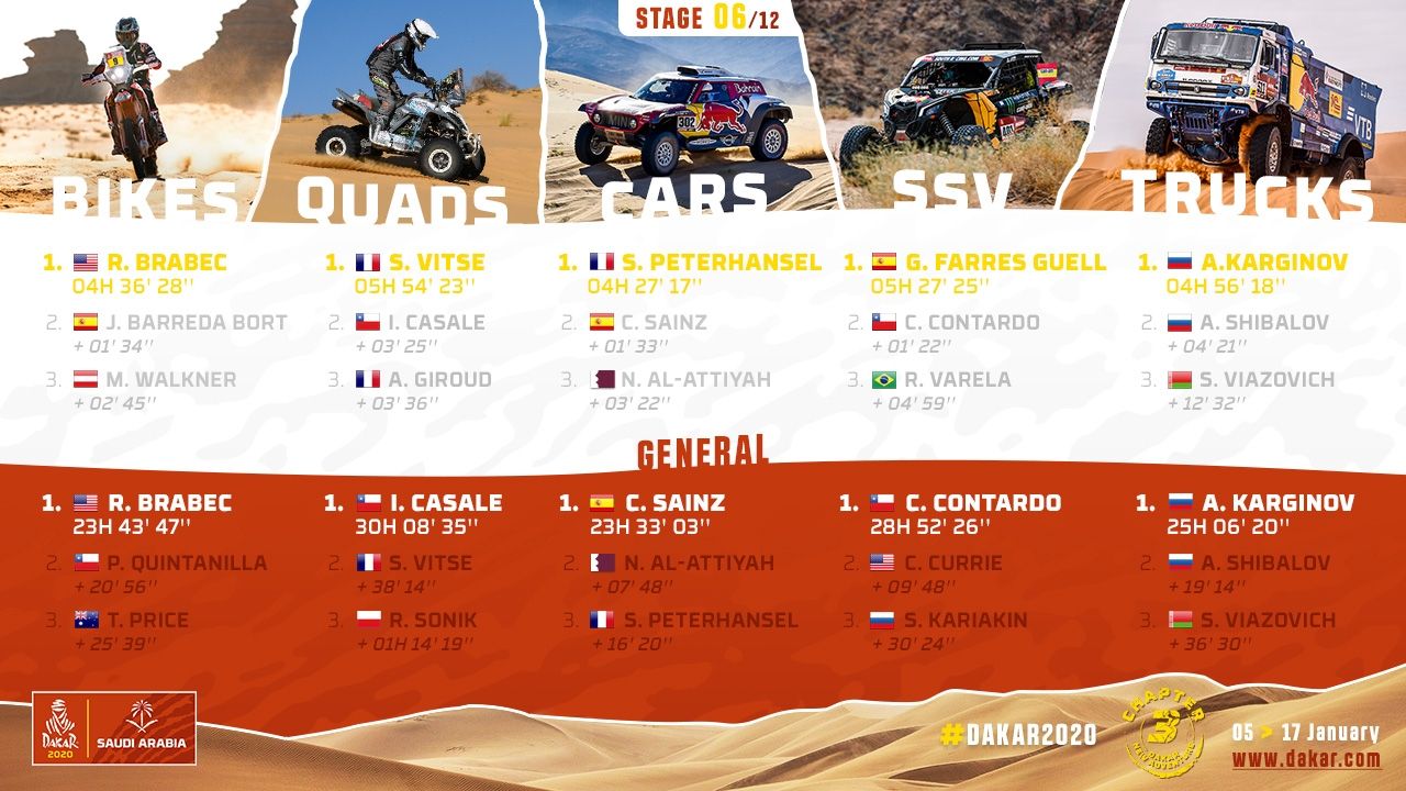 En camiones, el Dakar 2020 parece estar perfectamente diseñada para los camiones Kamaz, y especialmente para Andrey Karginov, quien este viernes se impuso en la sexta etapa, la cual unió Ha'il con Riyadh. En la general, Karginov se mantiene imbatible, con una ventaja de 19m14s sobre Shibalov y 36m30s sobre Viazovich.