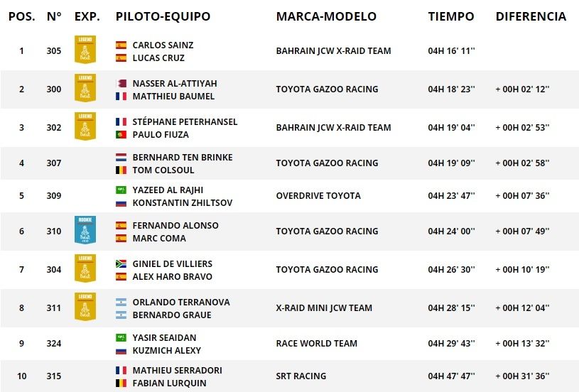 Así, el madrileño se mantiene líder en la clasificación general, ahora con 10 minutos de ventaja sobre el piloto catarí, ganador del último Dakar, y más de 19 sobre el francés, trece veces ganador del rally, de ellas seis en moto y siete en coche.
