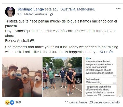 "Estamos en Geelog, a cien kilómetros de Melbourne. Por momentos viene la nube con humo y hay que usar barbijos para entrenar, dijo Lange desde Australia.