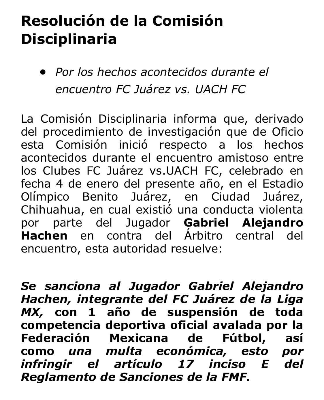 Gabriel Hachen, futbolista argentino que juega en el Juárez FC de la liga de México, fue suspendido por un año, así lo informó la Comisión Disciplinaria, tras agredir a un árbitro en el duelo amistoso ante los Dorados Fuerza UACH de la Liga Premier.