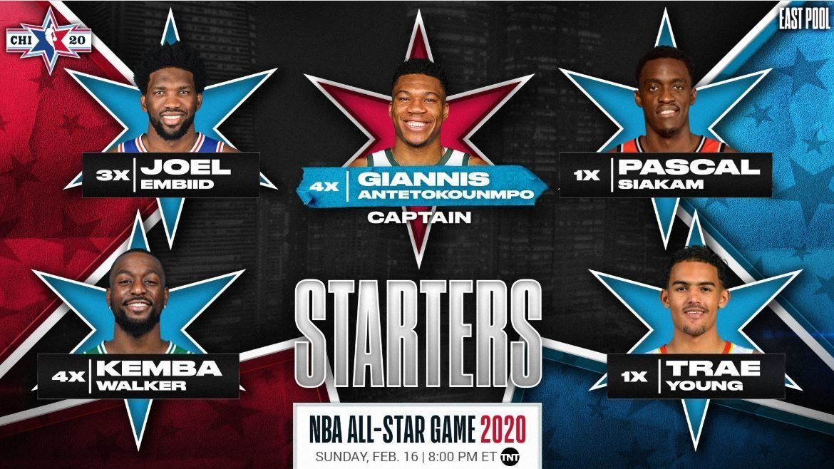 Giannis Antetokounmpo será el capitán en la Conferencia Este, en donde estará acompañado de arranque por Joel Embiid de los 76ers, Pascal Siakam de los Raptors, Kemba Walker de los Celtics y Trae Young de los Hawks.