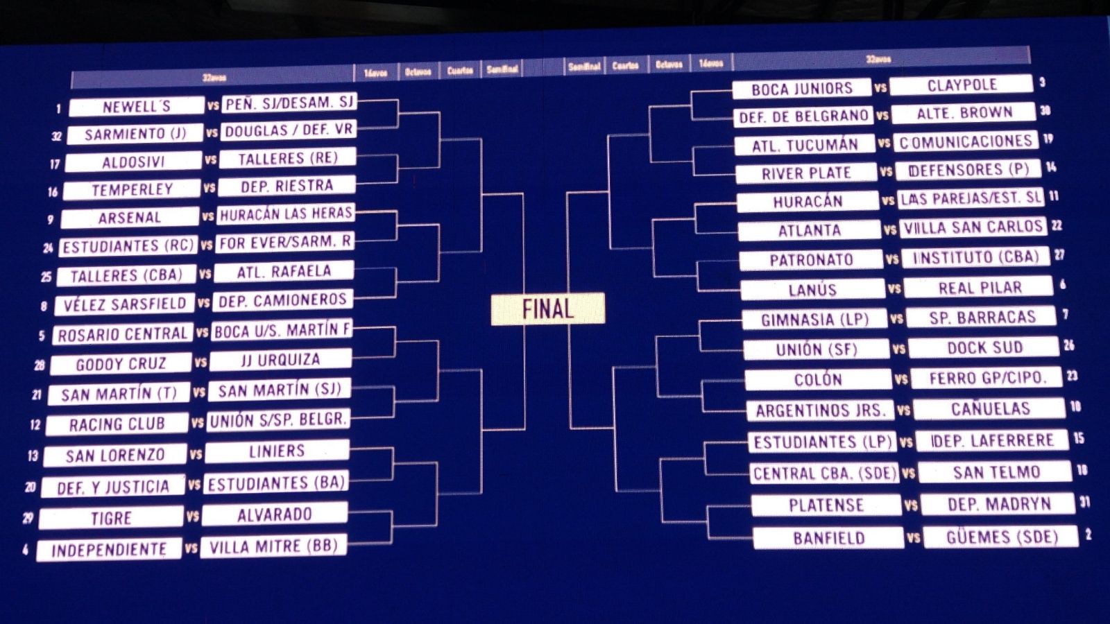 Independiente, que pondrá primera frente a Villa Mitre, y Racing, que esperará por Unión de Sunchales o Sportivo Belgrano, también quedaron del mismo lado del cuadro aunque podrían encontrarse recién en cuartos. San Lorenzo (debuta ante Liniers)-Huracán (contra Las Parejas o Estudiantes de San Luis) podría darse solo en la final.