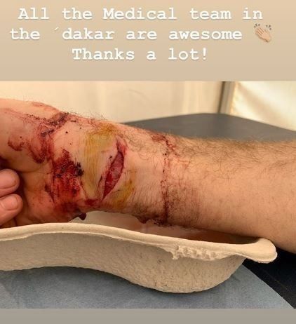 Así lo narró él mismo: "Pasan cosas improbables en el Dakar y hay que asumir las consecuencias. He realizado una especial excelente, con un buen resultado. Sin embargo, hacia el kilómetro 350 me he caído a solo 15 km por hora, pero haciéndome un buen corte en el brazo, así que me he realizado un torniquete con cinta adhesiva para parar la hemorragia. Temo que me tengan que poner puntos, porque no me gustan nada. Quería lograr una buena posición todos los días y tomarme la primera semana para calificarme bien. Esa sigue siendo mi intención", afirmó.