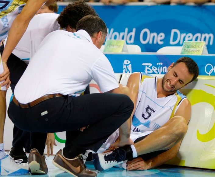 Ginóbili y su dolor por el tobillo que lo dejaría fuera del partido con Estados Unidos. Foto AP