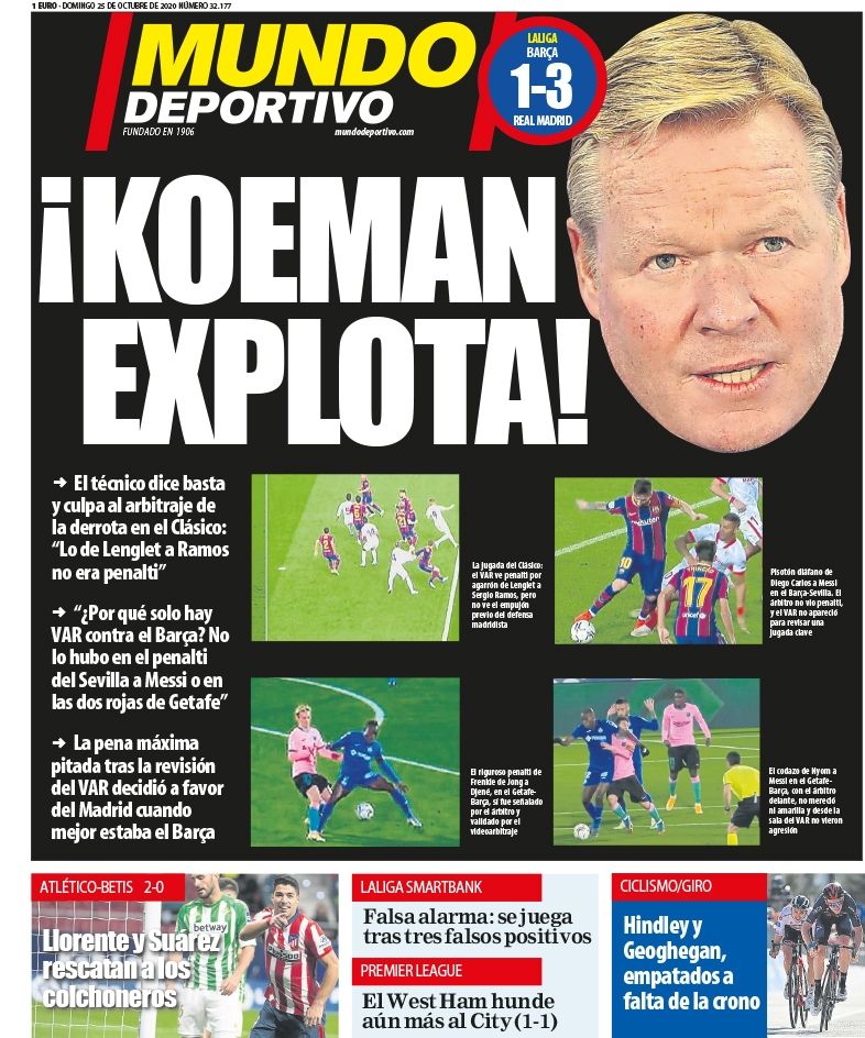 "¡Koeman explota!", tituló el diario catalán Mundo Deportivo haciendo referencia al enojo del entrenador holandés del Barcelona, quien apuntó directamente contra el árbitro y aseguró que "lo de Lenglet a Ramos no era penalti". Además, el DT se preguntó "por qué sólo hay VAR contra el Barça?".